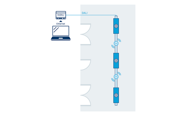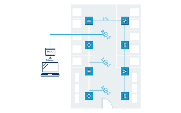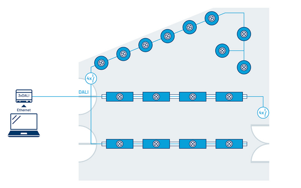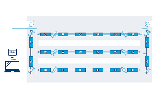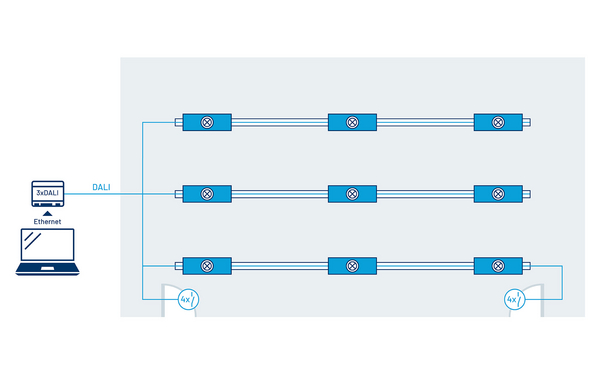 Skalierbare DALI-2-Lösung zur zentralen Steuerung, Überwachung und Wartung der Beleuchtung. Integrierte APIs ermöglichen die Anbindung der Beleuchtung an das Gebäudemanagementsystem (BMS).