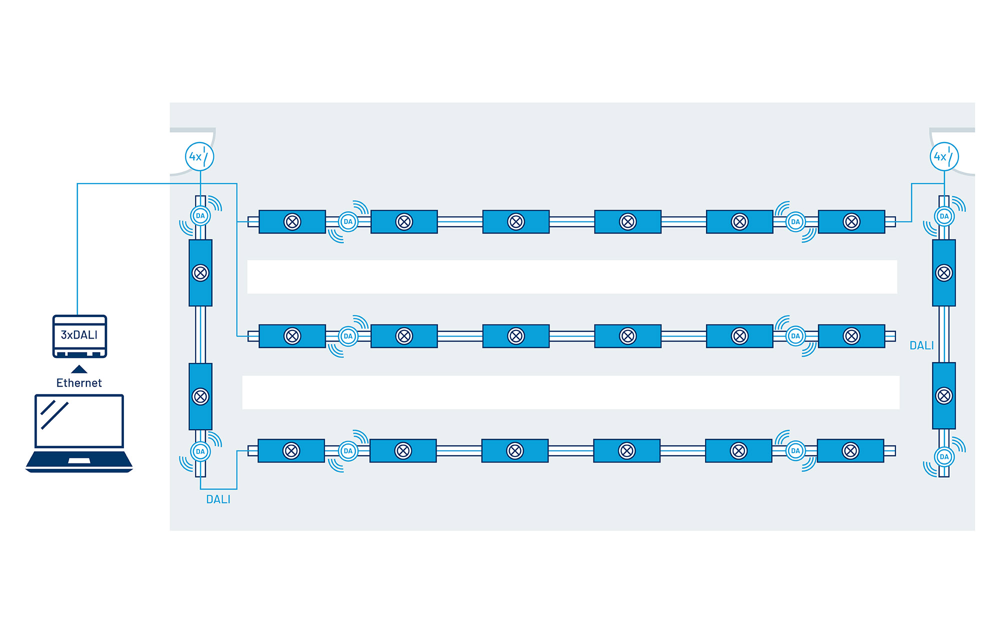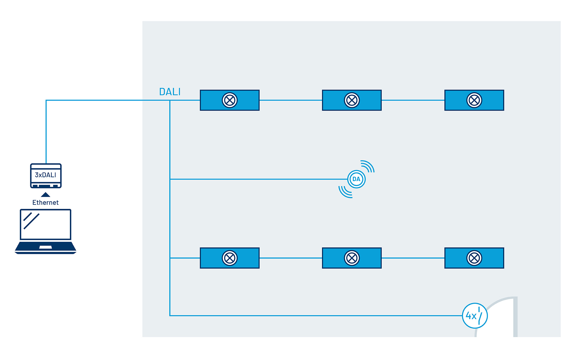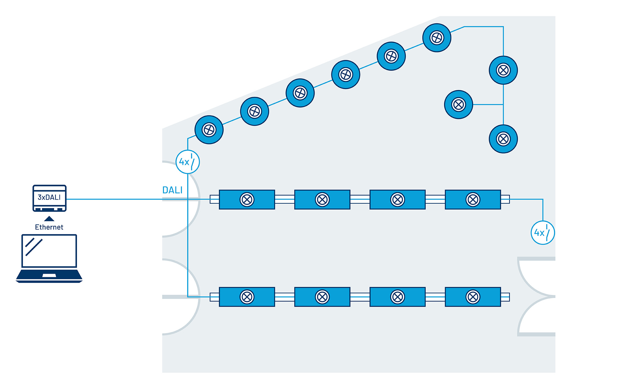- Alle Leuchten und Lichtsteuerungskomponenten sind über die zweipolige DALI- Busleitung miteinander verbunden und einzeladressiert, für maximale Flexibilität.