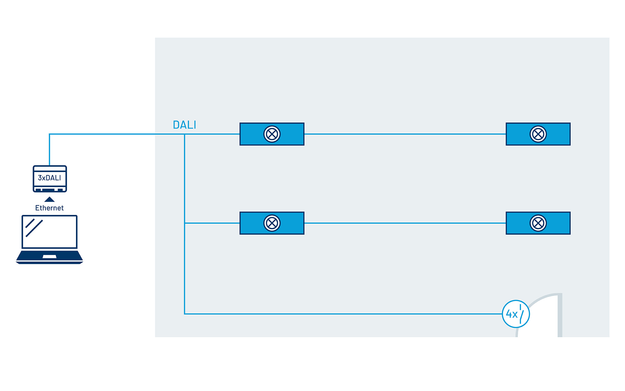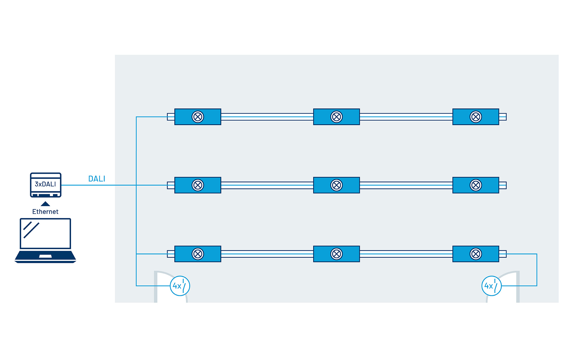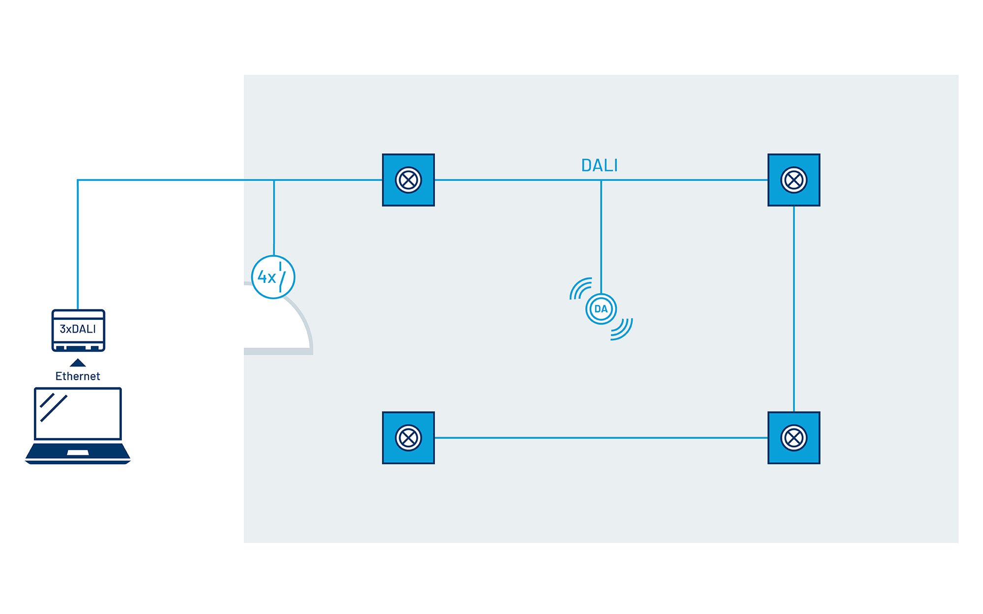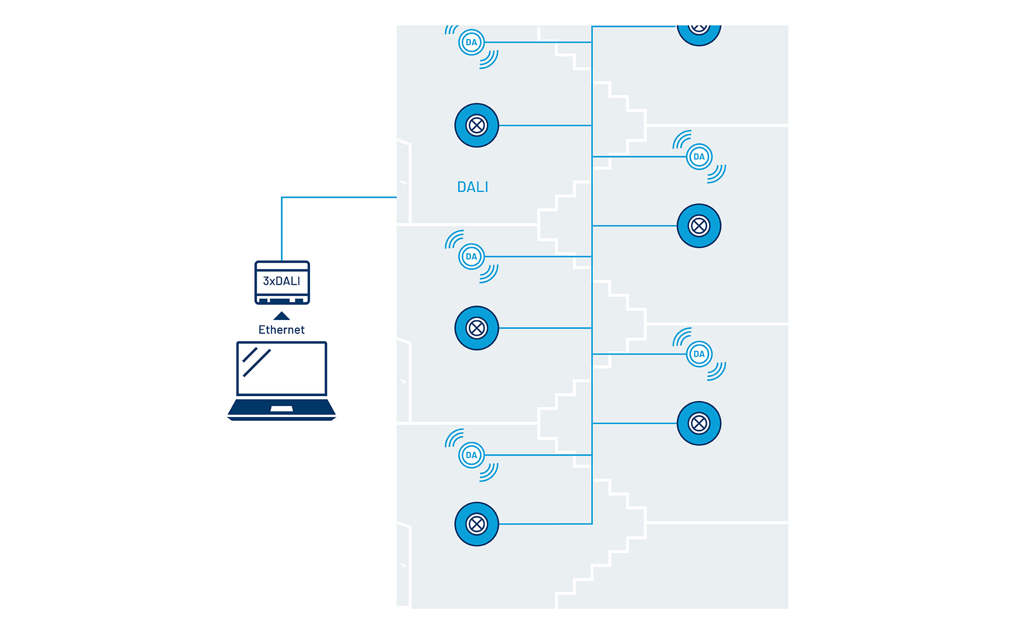 - Alle Leuchten und Lichtsteuerungskomponenten sind über die zweipolige DALI- Busleitung miteinander verbunden und einzeladressiert, für maximale Flexibilität.