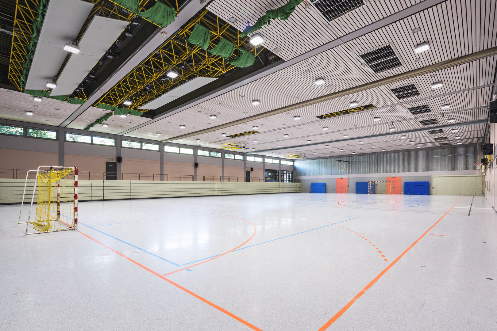 Die Beutelsbacher Halle in Weinstadt ist Austragungsort für zahlreiche Sport- und Freizeitveranstaltungen und bietet als Festhalle Platz für rund 1.000 Personen. Für die Beleuchtung der Mehrzweckhalle wurde eine schlichte, funktionelle LED-Lösung gesucht, die sowohl direkt als auch als Pendelvariante an die Decke montiert werden kann. Die ballwurfsichere Leuchte ROBUST erfüllt die mechanischen und lichttechnischen Anforderungen. Die schlichten Leuchten fügen sich optisch sehr gut in die Lamellendecke der 45 m langen Halle ein und bieten eine optimale und effiziente Beleuchtungslösung.