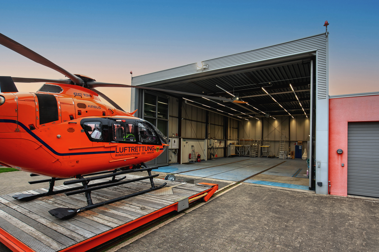 Eine perfekt eintrainierte Routine: Weit über 1000-mal pro Jahr startet Christoph 13 so zu Einsätzen, die Bereitschaft dauert täglich von Sonnenaufgang bis Sonnenuntergang. Die ruhigen Nachtstunden werden für Pflege und Wartung des Fluggeräts genutzt, deshalb ist gutes Licht im rund 6 Meter hohen Hangar so wichtig. Ein Fall für eine Lichtsanierung mit RIDI, denn die alte Beleuchtung war am Ende ihrer Lebensdauer angelangt: Ihre T8-Leuchtmittel fielen inzwischen unter das Leuchtstofflampen-Verbot und auch die Lichtqualität konnte heutigen Ansprüchen nicht mehr genügen.