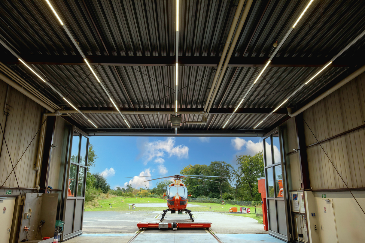 Im Luftrettungswesen zählt perfekte Organisation. Entsprechend klar waren die Anforderungen an die neue Beleuchtung des Hangars für Christoph 13, den in Bielefeld-Brackwede stationierten Rettungshubschrauber: Lichtqualität, Wirtschaftlichkeit und Zuverlässigkeit waren die Kriterien, mit denen das RIDI LINIA Lichtbandsystem bei Planern wie Nutzern punkten konnte.